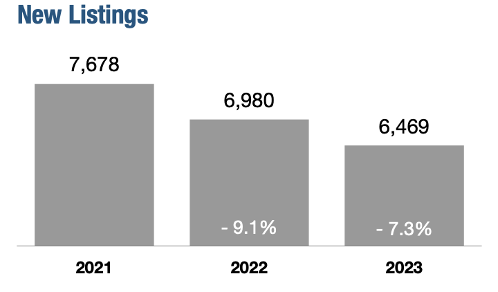 Comparing 2023 to the prior year, the number of homes available for sale was up by 23.3 percent. There were 1,299 active listings at the end of 2023. New listings decreased by 7.3 percent to finish the year at 6,469.